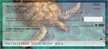There are several personal check designs that feature turtles in beautifully illustrated images. You can let Sea Turtles glide effortlessly across your turtle checks when you purchase check designs created by artist David Dunleavy, for instance.